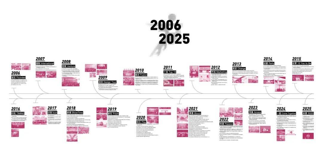 ◎ 广州设计周二十年历程图 呼应当下到未来的 “从房到家”人居全案服务时代, 能不能用一句话概括广州设计周展会? 我们调研采访了一些设计师、品牌商、经销商 和甲方业主时给到的建议, 便试着去归纳提炼, 于是,有了第一句话: “全案选材全链品类全在广州设计周”。 落实到2025广州设计周展会, 我们以“亲爱”思维 深耕人居全案设计+选材领域, 组织涵盖人居空间全案所需的 “外装—内装—后装”超全供应链和服务链 相关企业和机构参展亮相。 包含「户外花园庭院—精造工法技艺—智装风水电气—面层装饰材料—入户安防门窗—全屋定制家居—全屋家具—软装灯光—家居用品—艺术信物—家政服务—优雅生活方式」的人居全案选材全链品类,分类设置于海珠馆+保利馆+国采馆。