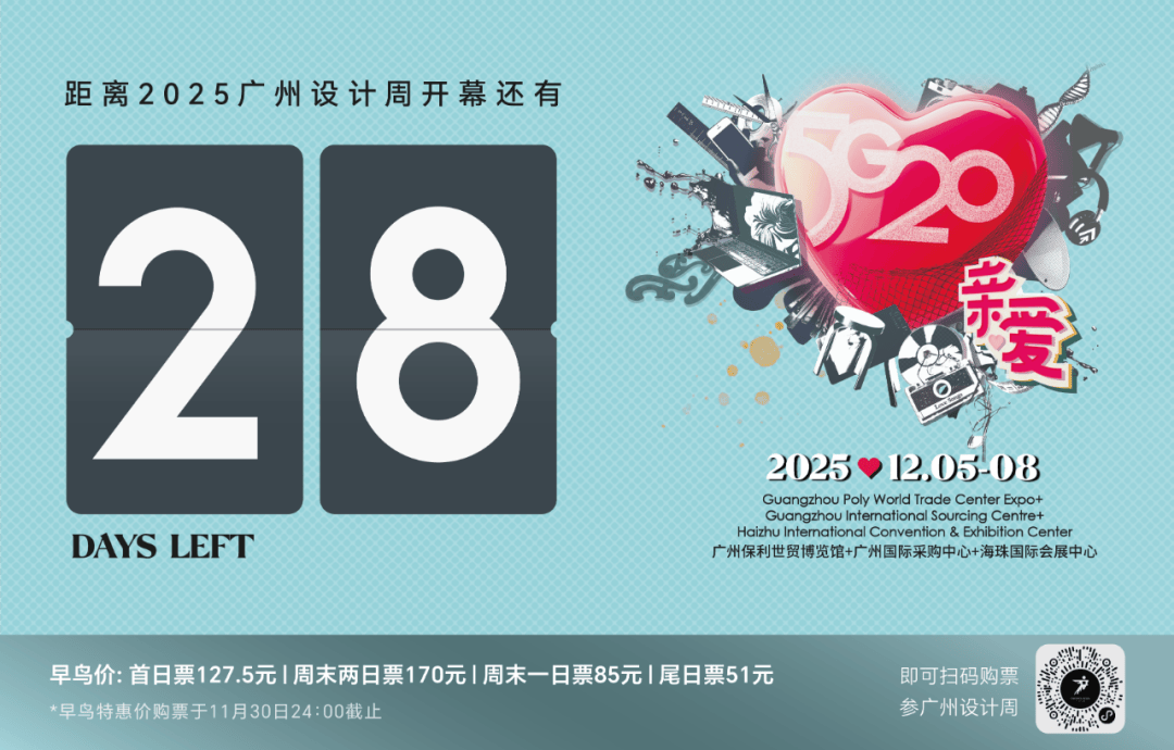 亲爱的家人们,好! 距离2025广州设计周开幕仅剩28天, 期待和大家的年度欢聚! 今年广州设计周20年, 主题——“5G20亲爱”